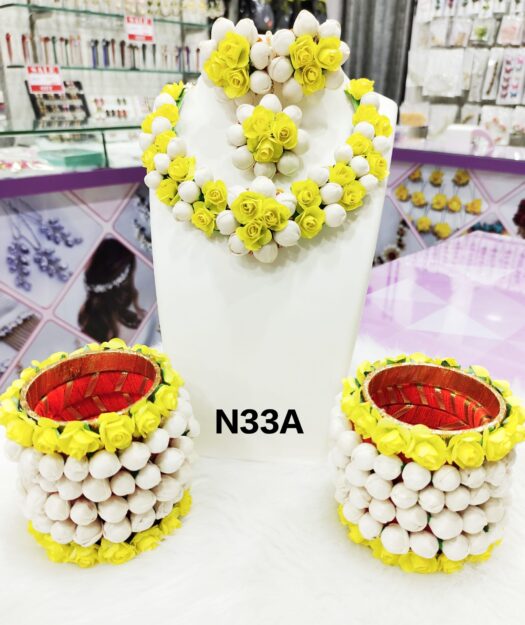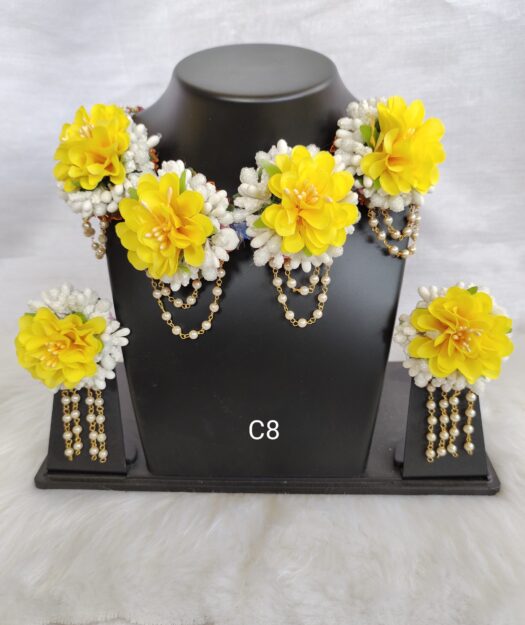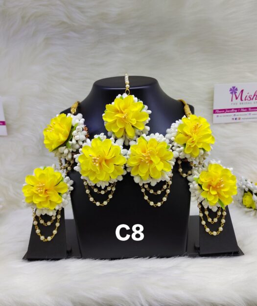Yellow and white Haldi Bridal Floral Jewellery Set with Chains – includes Necklace, Earrings, Bracelets plus ring and maang teeka.