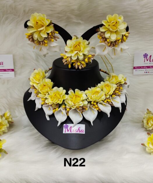 Yellow and white Haldi Bridal Floral Jewellery Set with Chains – includes Necklace, Earrings, Bracelets plus ring and maang teeka.