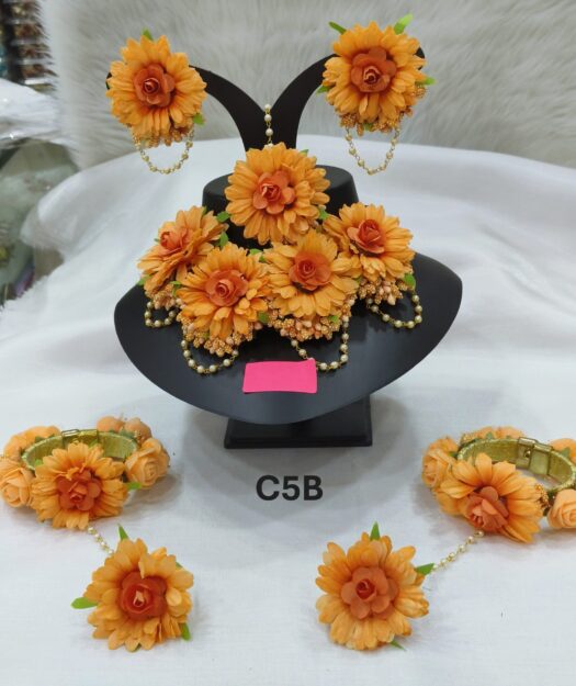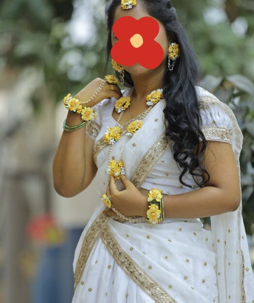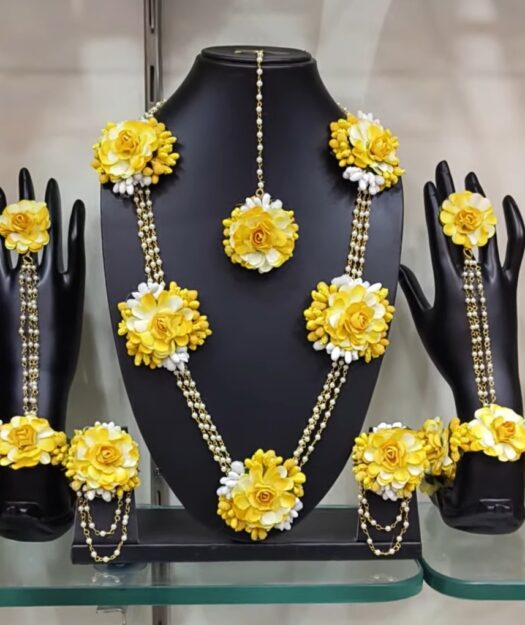 Handcrafted vibrant yellow Haldi floral jewellery set for brides, designed with red roses. This complete bridal set includes necklace, earrings, maangteeka, bracelet plus rings, and waistband with pearl chain detailing.