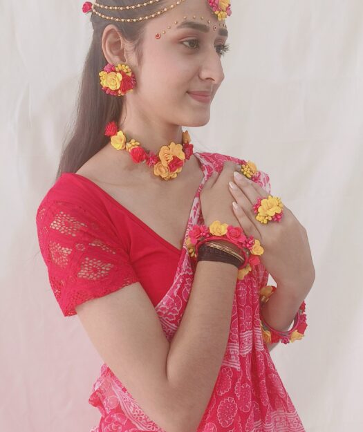 Handcrafted vibrant yellow Haldi floral jewellery set for brides, designed with red roses. This complete bridal set includes necklace, earrings, maangteeka, bracelet plus rings, and waistband with pearl chain detailing.