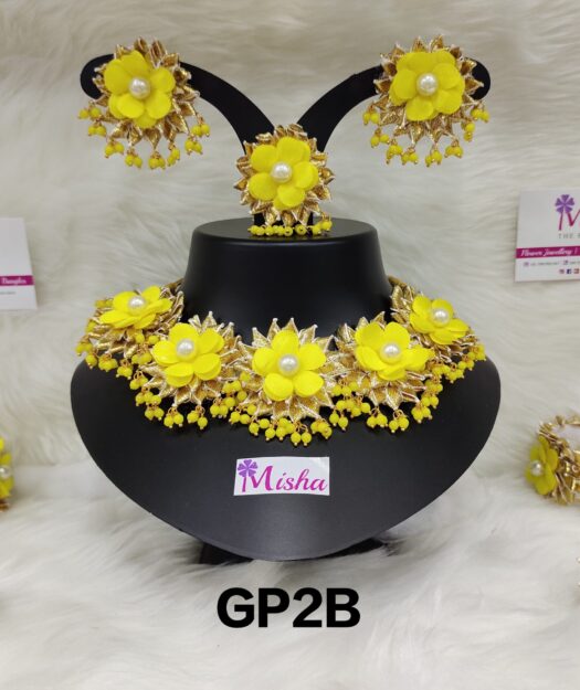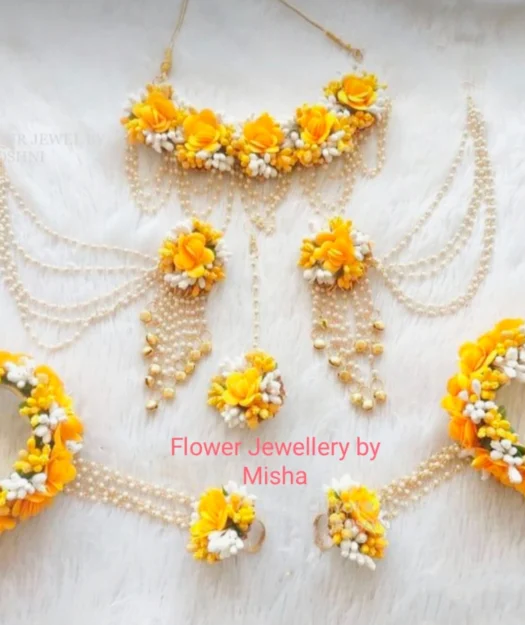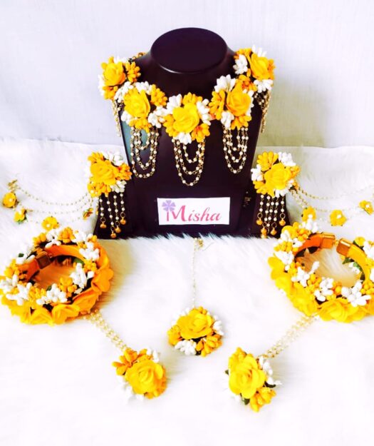 Handcrafted vibrant yellow Haldi floral jewellery set for brides, designed with red roses. This complete bridal set includes necklace, earrings, maangteeka, bracelet plus rings, and waistband with pearl chain detailing.