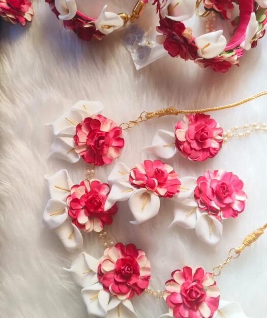 Handcrafted vibrant yellow Haldi floral jewellery set for brides, designed with red roses. This complete bridal set includes necklace, earrings, maangteeka, bracelet plus rings, and waistband with pearl chain detailing.
