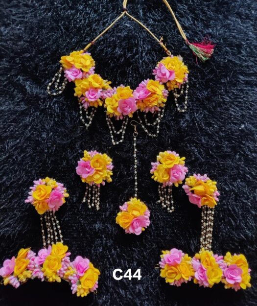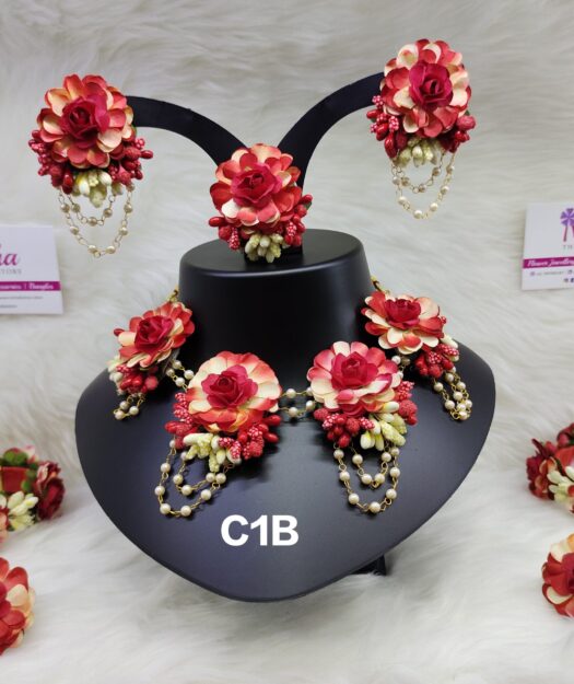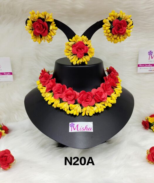 Handcrafted vibrant yellow Haldi floral jewellery set for brides, designed with red roses. This complete bridal set includes necklace, earrings, maangteeka, bracelet plus rings, and waistband with pearl chain detailing.